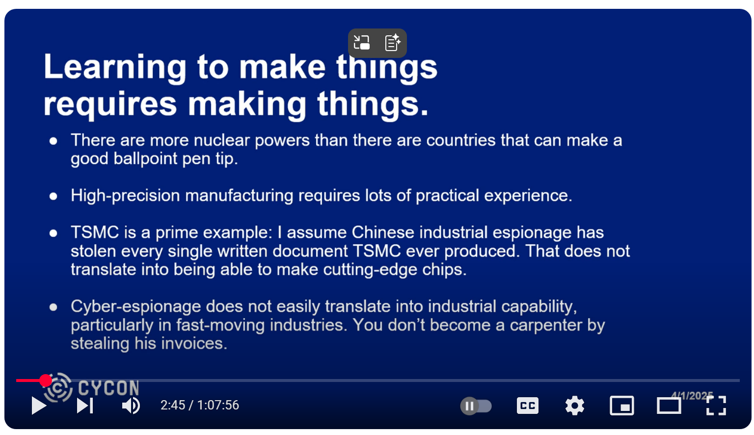 [image: image.png] Every so often I poke my head out, gopher-like, from the tunnels where I am furiously vibe-coding, or as it's going to be known a couple years from now, coding. I think it's probably true that coding used to be a high octane sport for concentration freaks as deep in the zone as a sperm whale hunting giant squid by listening to the faint echoes of pings off squishy bodies leagues away. But coding is now a juggling competition where the winners are over-caffeinated ADHD insectivorous bats tracking the results of five different queries into as many LLM-based coding systems and context switching, running tests, and re-querying at a rate that would drive most people bananas. In other words, to compete in this day and age you do have to know your LeetCode, but you have to do it in parallel, using Codex, or Windsurf, or Codex-CLI, or cutting and pasting bits of code into o1-pro, but all at once, choosing which LLM-assistant-coder depending on what exact kind of programming issue you're trying to solve. On one hand, these tools are very much junior engineers, and make simple mistakes, and on the other hand, collectively they are better than you will ever be and realizing that as soon as possible is a big advantage. I spent some time, while contemplating obscure and bespoke flavors of obsolescence, to listen to Halvar's most recent talk. Everyone should. It is here: https://www.youtube.com/watch?v=qllU_B_Rmis . [image: image.png] "Cyber-espionage does not easily translate into industrial capability, particularly in fast moving industries. You don't become a carpenter by stealing his invoices" - Halvar And of course not? But that's not what hackers do. As we learned from listening to Grugq's keynote <https://conference.hitb.org/hitbsecconf2023hkt/speaker/the-grugq/> the most likely scenario is that hackers attack the carpentry problem as a system - use the invoices and outgoing quotes to drive all the business to yourself, along with stealing all their best people by offering them exactly 2X their salary. Going active sometimes means DoSing the supplier of some company so it misses a key deadline with its customer-base, which then moves to your more reliable, cheaper, product, built by their former head of engineering. And I firmly believe that few scientific and engineering problems are so hard that they can't be replicated given access to the right cyber team and all the resources a nuclear power can throw at them if they are a national priority. Half of the cyber policy world still thinks that cyber norms are a thing! We have labored for too long under the belief that we were going to be able to set the rules to the game in a new domain. But the rules are what they are. The terrain has no master. -dave