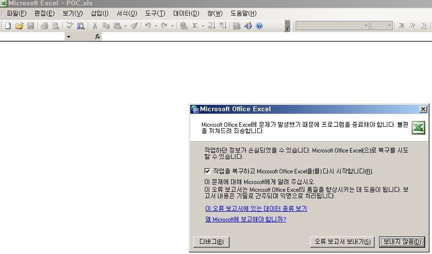Hi Forks! I sent this crash again to full-disclosure to request crash analyze, exactly, version test. we can test this crash in there. - office xp (excel 2002) sp0 - office xp sp1 - office xp sp2 - office xp sp3 - office 2003 (excel 2003) sp0 - office 2003 sp1 - office 2003 sp2 - office 2003 sp3 exploitability: maybe you can try exploit with superBook, XCT, CRN records sequence. superBook record is the uninitialzed referenced object. request to exploit the crash. x90c