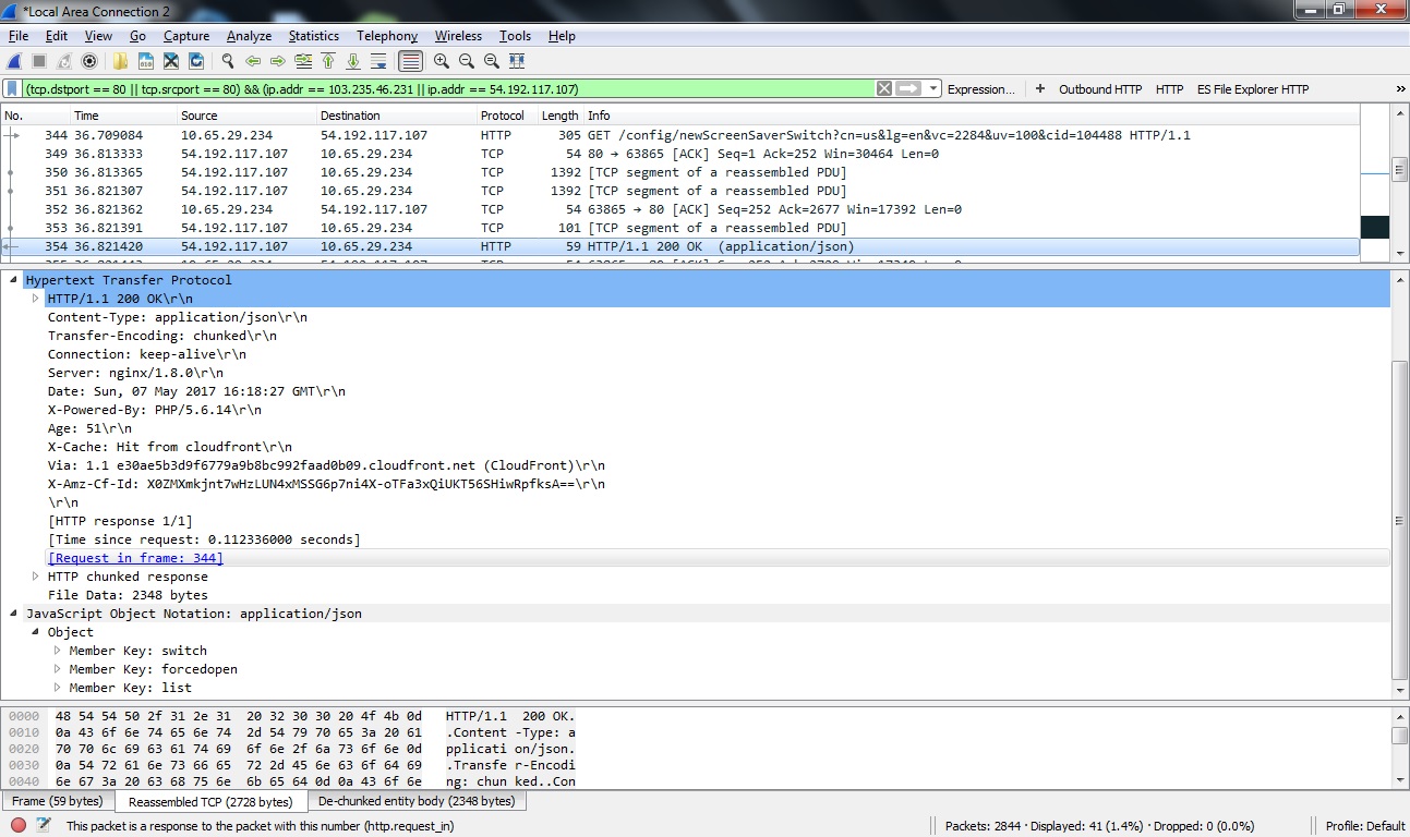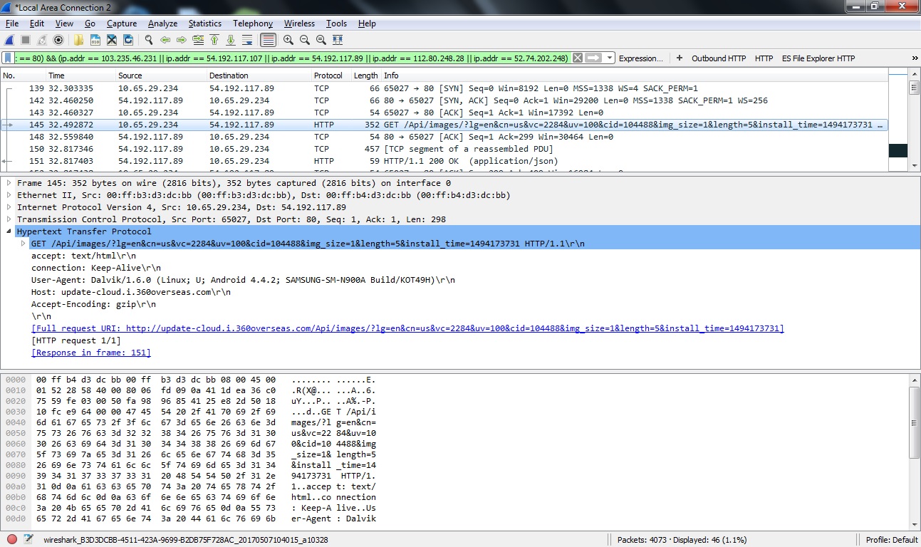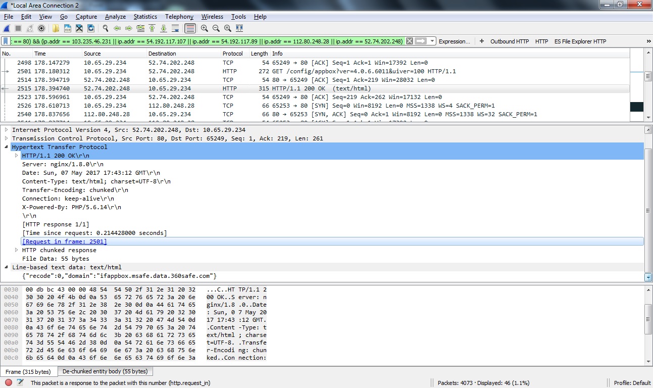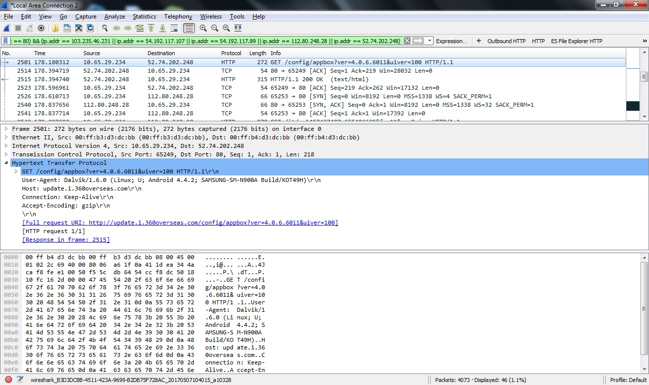 Hi Craig, As was suggested by Daniel (http://seclists.org/fulldisclosure/2017/May/9) , I installed the 360 Security app on BlueStacks Android emulator and captured HTTP packets exchanged by this app via Wireshark. Below is a screenshot from the Network Connections app running on BlueStacks showing the 360 Security connections that it was able to detect: From the Wireshark capture, following are the HTTP GET and GET response details for the IP addresses, along with their WHOIS links: 54.192.117.107: (https://whois.domaintools.com/54.192.117.107) 103.235.46.231: (https://whois.domaintools.com/103.235.46.231) Subsequently, I closed BlueStacks and re-opened it again and monitored the 360 security app connections via Network Connections app and HTTP packets via WireShark. Below is a screenshot from the Network Connections app showing the 360 Security connections that it was able to detect this time: From the Wireshark capture, following are the HTTP GET and GET response details for the IP addresses, along with their WHOIS links: 54.192.117.89: (https://whois.domaintools.com/54.192.117.89) 52.74.202.248: (https://whois.domaintools.com/52.74.202.248) 112.80.248.28: (https://whois.domaintools.com/112.80.248.28) 103.235.46.231: (https://whois.domaintools.com/103.235.46.231) As can be seen from the above screenshots from both the sessions the "lg=en&cn=us&vc=2284&uv=100&cid=104488&img_size=1&length=5&install_time=1494173731" string input as a parameter in the HTTP GET requests to update-cloud.i.360overseas.com IP addresses uniquely identifies the instance of 360 security app installed on the device and hence the device. So, anyone monitoring the insecure HTTP packets exchanged with update-cloud.i.360overseas.com IP addresses can easily track the IP addresses used by the device, which is a huge privacy risk. Also, the insecure HTTP packets exchanged with Baidu IP addresses in HongKong, bdimg.com IP addresses in China and update.i.360overseas.com IP addresses in Singapore expose the IP address used by the device as using the 360 security app, in those foreign countries. I think, this vulnerability deserves a CVE in the NVD database (https://nvd.nist.gov/vuln/search). The Wireshark packet captures for both the sessions are attached below. Thanks. On Sun, May 7, 2017 at 03:42 AM, Craig Young wrote: I would advise running a packet capture to see what data is sent. https://play.google.com/store/apps/details?id=app.greyshirts.sslcapture (https://play.google.com/store/apps/details?id=app.greyshirts.sslcapture) will let you do this from your device without root. -Craig On Thu, May 4, 2017, 5:10 PM seclists () email tg (mailto:seclists () email tg) wrote: I reinstalled the 360 security app on my phone to check the network connections it used & found via the Network Connections app that it did indeed use an insecure HTTP connection to exchange data with IP address 52.85.77.42 which is assigned to Amazon network(https://www.whois.com/whois/52.85.77.42 (https://www.whois.com/whois/52.85.77.42)). Attached is a screenshot from the network connections app showing this connection. From the 360 security app privacy policy page(http://www.360securityapps.com/m/en-us/about/privacy (http://www.360securityapps.com/m/en-us/about/privacy)) it can be seen that it uploads sensitive information about installed programs to a cloud security center. So, I am guessing that the above IP address corresponds to an Amazon cloud storage server. So, there is still a security hole in this App, where it may be transmitting sensitive system information via an unencrypted HTTP connection. Thanks. ----- Reply message ----- From: "Daniel Wood" To: Cc: Subject: [FD] 360 security android app snoops data to China Unicom network via insecure HTTP Date: Sun, Apr 30, 2017 6:26 AM Can't you just run the app in an Android emulator and shark it? Sent from my iPhone
