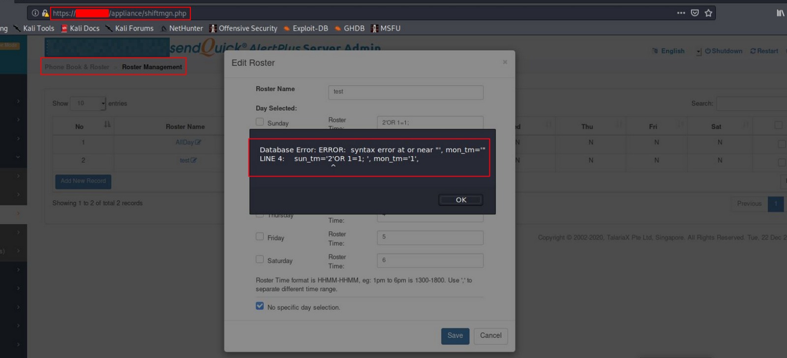 Dear Talariax, We discovered a SQL injection vulnerability on one of your product Talariax sendQuick Alertplus server admin during the period of Q4-2020 to Q1-2021. This commercial off-the-shelf product was used by one of our clients and they may or may not have reported this to you. The finding was subsequently addressed and finding was closed (as shown in the screenshots the affected patch no 8HF8, and the fix released was patch no 8HF11) although we do not have the specific product version that is affected but we have reason to believe that at that point of testing the product Talariax sendQuick Alertplus server admin version was version 4.3 (do correct us if this is wrong). We felt responsible to share this finding with you directly so that you could ensure this vulnerability would be (or had been) addressed in all subsequent releases. *Finding details:* SQL Injection in the web interface of Talariax sendQuick Alertplus server admin allows an authenticated user to perform error-based SQL injection via unsanitized form fields. *Affected URL:* /appliance/shiftmgn.php *Evidence* (see attached screenshots evidence*.jpeg) We attached the following screenshots to evidence that: (1) Vulnerability was discovered showing that there is an error message which states that the SQL Syntax error after a single quotation mark was appended upon the form submission causing an error message which is thrown from the database (2) Finding was subsequently verified as fixed after input validation was implemented in the fields. We would also like to seek your approval for us to perform responsible disclosure to the public of this information. The intention is to help potential victims gain knowledge and raise awareness that vulnerability exists, Talariax could also provide us a recommendation if you so please so that we could include in the writeup (e.g. such as to update to the latest patch and versions). Please note that if we don't hear from you within 14 days, we will proceed to do full disclosure through https://nmap.org/mailman/listinfo/fulldisclosure <https://nmap.org/mailman/listinfo/fulldisclosure>. -- Yours Sincerely, Edmund Ong