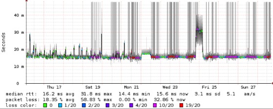 Interesting. I began to notice trouble reaching google about a week ago from 2 different east-cost Verizon FiOS lines -- one business and one residential -- but my problem appears to be congestion at the AS701 <> AS15169 border. I'm not noticing any loss across AS701. These problems began around 9am Eastern on Saturday Feb 19th -- see attached smokeping graph. You can see the diurnal pattern in the loss -- packet loss peaks between 9a-4p ET. Of course, I can get toipv6.google.com without any loss at all via my HE tunnel! In both cases, mtr shows ~50% loss beginning at google-gw.customer.alter.net (152.179.50.62), the first hop in AS15169. It's clear that I must be losing more ICMP than TCP packets given that google webpages come up fairly quickly, but youtube videos hang ever since this started. Anybody else seeing this? Thanks, -Chris -- Chris Tracy <ctracy () es net> Energy Sciences Network (ESnet) Lawrence Berkeley National Laboratory