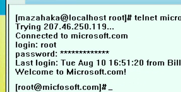 Reminds me of [0] I like the thoroughness combined with the typos. They used a real Microsoft IP - 207.46.250.119 - although not one currently used for web hosting; yet, in the telnet screenshot, the computer identifies its hostname to be 'micfosoft.com' [1] And is it just me, or does he have insecure.org open behind the other windows on that computer[2]. Also, the movie was apparently produced in 2006, so 4.03 was state of the art [3]. [0] http://bsd.slashdot.org/article.pl?sid=02/04/02/130234&tid=7 [1] http://nmap.org/images/khottabych/telnet-ms-hack-720x368.png [2] http://nmap.org/images/khottabych/gena-hacking-720x368.png [3] http://nmap.org/changelog.html -- Michael Pattrick http://www.rhinovirus.org/math _______________________________________________ Sent through the nmap-dev mailing list http://cgi.insecure.org/mailman/listinfo/nmap-dev Archived at http://SecLists.Org
