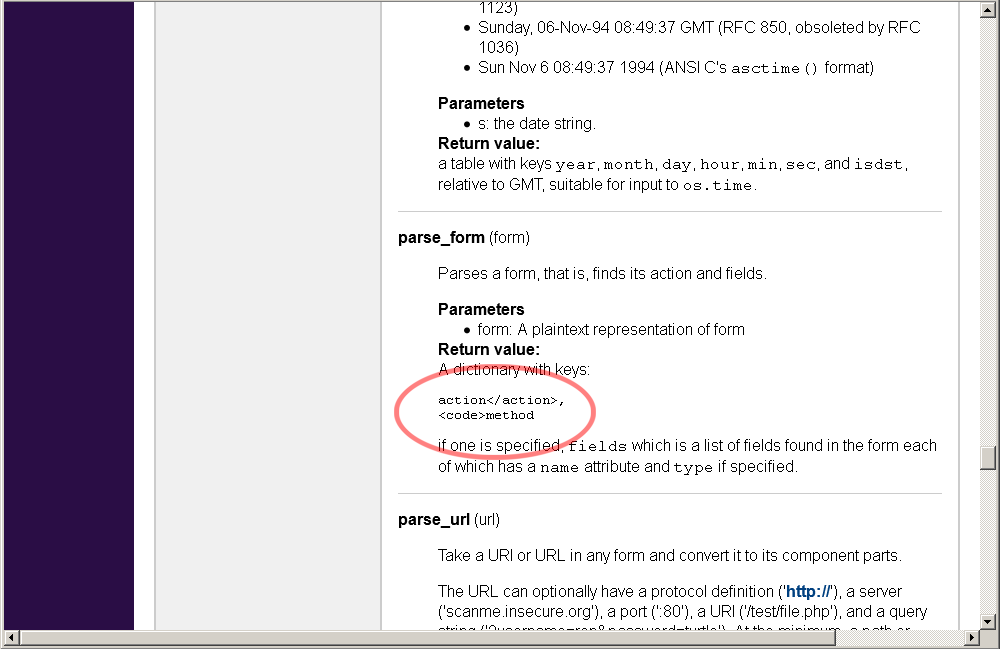The current version of http.lua contains a trivial bug in the documentation for parse_form(). Please see the patch below and the attached screen capture for details. http://nmap.org/nsedoc/lib/http.html#parse_form Cheers, nnposter Patch against revision 33574 follows: --- nselib/http.lua.orig 2014-08-18 11:33:49.085157500 -0600 +++ nselib/http.lua 2014-08-18 11:35:39.873972000 -0600 @@ -1904,7 +1904,7 @@ --- -- Parses a form, that is, finds its action and fields. -- @param form A plaintext representation of form --- @return A dictionary with keys: <code>action</action>, +-- @return A dictionary with keys: <code>action</code>, -- <code>method</code> if one is specified, <code>fields</code> -- which is a list of fields found in the form each of which has a -- <code>name</code> attribute and <code>type</code> if specified.