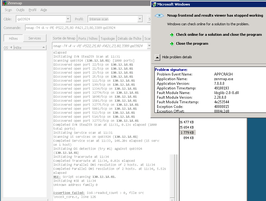 Bonjour, J'ai un problème avec la version nmap 6.47 et 7.00 (ok avec la version nmap 5.21) J'ai testé sur un serveur windows 2008 et 2008R2 et j'ai le message suivant : [cid:image001.png@01D125E3.CEBF9140] Auriez-vous une idée pour résoudre ce problème ? Cordialement , Elie Elkoubi Consultant GFI Direction de la production Tour Franklin - Cedex 11 - 92042 Paris La Défense Email: elkoube () allianz fr<mailto:elkoube () allianz fr> Tél. : 01.58.85.17.40 - Fax : 01.58.85.56.52 http://www.allianz.fr/ ------------------------------ Ce message est protege par les regles relatives au secret des correspondances; il peut en outre contenir des informations a caractere confidentiel ou protegees par differentes regles et notamment le secret des affaires; il est etabli a destination exclusive de son destinataire. Toute divulgation, utilisation, diffusion ou reproduction (totale ou partielle) de ce message, ou des informations qu'il contient, doit etre prealablement autorisee. Tout message electronique est susceptible d'alteration et son integrite ne peut etre assuree. Le Groupe Allianz decline toute responsabilite au titre de ce message s'il a ete modifie ou falsifie. Si vous n'etes pas destinataire de ce message, merci de le detruire immediatement et d'avertir l'expediteur de l'erreur de distribution et de la destruction du message. This message is protected by the secrecy of correspondence rules; furthermore it may contain privileged or confidential information that is protected by law, notably by the secrecy of business relations rule; it is intended solely for the attention of the addressee. Any disclosure, use, dissemination or reproduction (either whole or partial) of this message or the information contained herein is strictly prohibited without prior consent. Any electronic message is susceptible to alteration and its integrity can not be assured. Allianz Group decline any responsibility for this message in the event of alteration or falsification. If you are not the intended recipient, please destroy it immediately and notify the sender of the wrong delivery and the mail deletion. ------------------------------