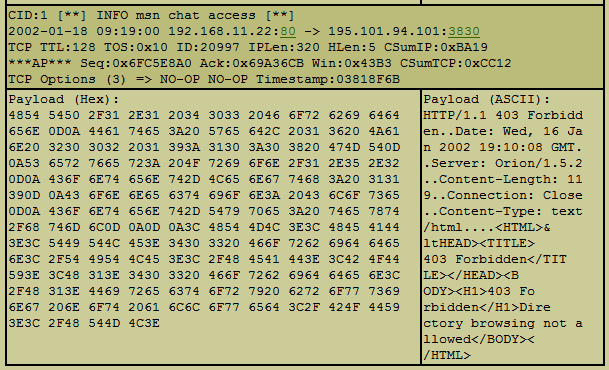 -----Original Message----- From: Paul Slinski [mailto:pauls () globaliqx com] Sent: Friday, January 18, 2002 10:06 AM To: Snort-Users Subject: Too many false positives Sensitivity: Confidential Does this look like msn access to you? I have 3 Linux servers running 1.8.3 all logging to a MySql database at a remote location through ssh tunnels. Sometimes, I'm not sure why the logs show strange results for signatures. Is this a common problem? I can send more examples if needed. --- Paul Slinski <pauls () globaliqx com> Network Administrator Global IQX