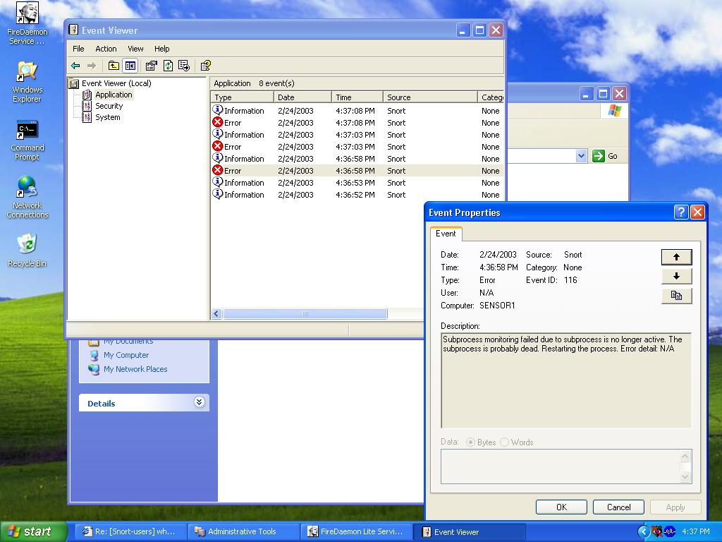 I am attempting to install Snort IDS. I have MySQL, ACID, and Snort installed on a single machine and it is working in a Windows XP environment. I am attempting to implement a centralized database with multiple sensors. However, I can not get the remote sensor to talk to the MySQL database. I download MyODBC and loaded it on the remote sensor and modified the Snort.conf file as follows: output database: log, mysql, user=snort password=snort dbname=snort host=10.10.29.20 sensor_name=sensor1 detail=full user name = snort password = snort database = snort ip address of machine were MySQL database is located = 10.10.29.20 The following error is generated in the application even log: <<Snort Error.JPG>> Can you please give me any idea of what I could be missing? Maria E. Eirea Senior Operating Systems Programmer