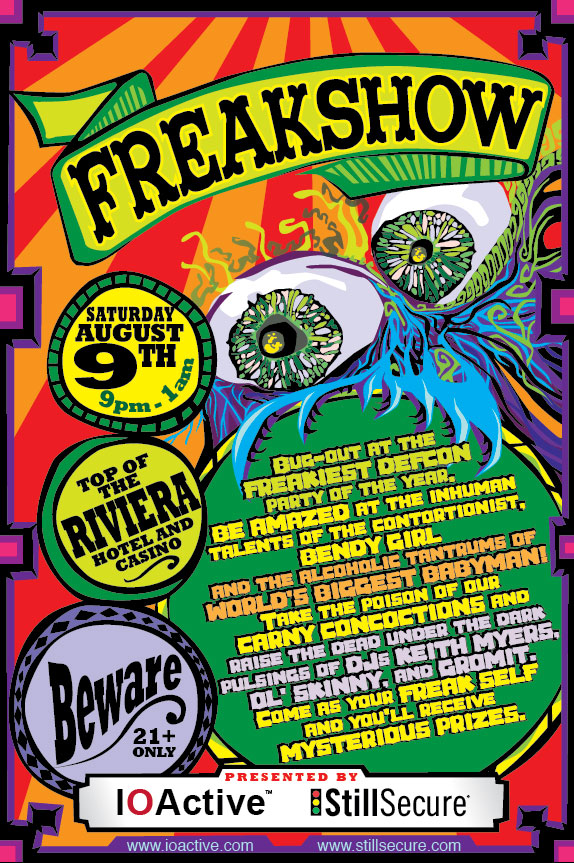 Hey folks, For anyone heading out to Defcon this year, we'll be throwing a party Saturday night with the folks at IOActive. I've attached the invite with the details but it's basically as follows: What: Defcon Freakshow When: Saturday, August 9th from 9pm-1am Where: Top of the Riviera Why: Free drinks, freaky folks and lots of fun No need to RSVP as it's not that kinda party but if you do make it out, be sure to stop by and say hey. Special VIP treatment goes out to anyone who shows up in a freak costume :) Hope to see ya in Vegas! Cheers, Jennifer -- Jennifer Steffens StillSecure Director, Open Source Strategy C 202.409.7707 www.stillsecure.com