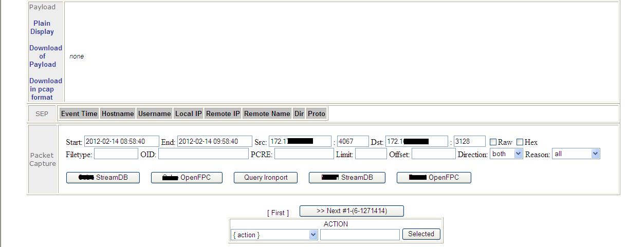 +1. I also have about 7TB and streamDB does take about a second or so to lookup stream information. I also have OpenFPC running for full packet captures, and I can't remember the last time I went to those. I have mine integrated into BASE (see the screenshot), BOTH streamdb and OpenFPC (for multiple locations). This has made Snort event analysis so much easier and less time consuming. -----Original Message----- From: Martin Holste [mailto:mcholste () gmail com] Sent: Tuesday, February 14, 2012 6:58 AM <snip> It does all of this in less than one second even on a 10 TB data store, because the flows themselves are indexed by IP and timestamp. We run full pcap alongside StreamDB and almost never need to go back and wait around to grab pcap.
