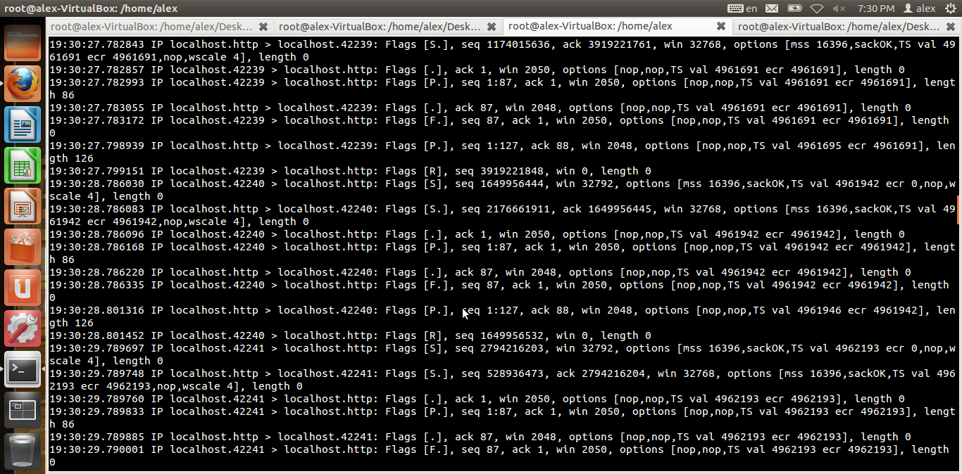 Doesn't anyone have an idea?? All i want is Snort to capture traffic from the lo interface. Until now i cannot see any packets coming if i send them from the localhost (guest machine 127.0.0.1) to the same machine's web server (localhost 127.0.0.1). I've attached a screenshot from tcpdump. This is the traffic from lo interface when i'm not sending any packets from a slowhttp-tool. Always, i can see a connection opening from a different port from localhost to localhost's port 80, then closing, and then opening another one...I can't understand what's happening!!! Furthermore, tcpdump catches the attacking packets in the lo interface. in snort.conf: ipvar HOME_NET 127.0.0.1