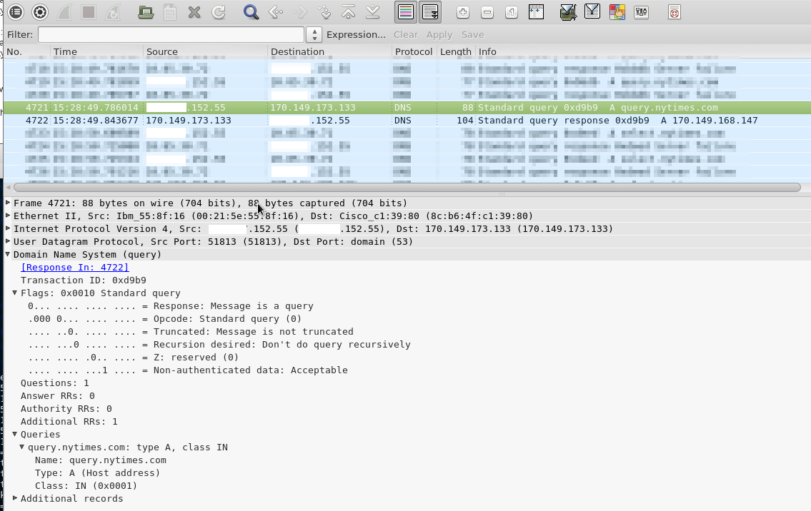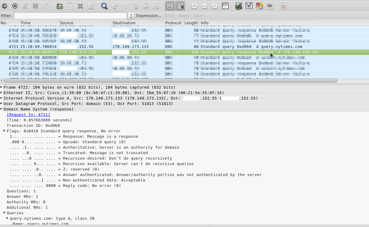 I've attached screenshots showing the query and response info from wireshark.