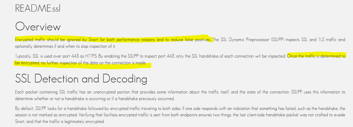Hi all I have a question… I hope you guys can suggest me something to read about it… Considering that a great number of websites use SSL and the Snort documentation suggests that we should not enable encrypted traffic verification.. what it is going to happen ? 1 - Should Snort be deployed with powerful hardware capable to deal with the expensive computational demand generated by encrypted traffic ? 2 - Should I remove noinspect_encrypted from my snort.conf and enable the encrypted verification ? 3 - if I enable that, will Snort verify the whole packet contents ? (data payload) Thank you Marcio