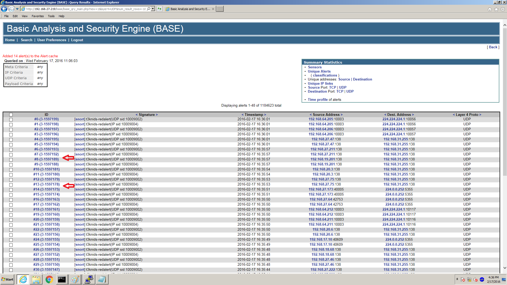 Hi, we are using Barnyard2 version 2.1.13<build 327> and attached error sc r e e n shot for information , snort version 2.9.5.5 GRE [build 205] libpcap version 1.3.0 PCRE 8.30 2012-02-04 Zlib 1.2.7 Mysql snort databese tables, mysql> show tables; +------------------+ | Tables_in_snort | +------------------+ | acid_ag | | acid_ag_alert | | acid_event | | acid_ip_cache | | base_roles | | base_users | | data | | detail | | encoding | | event | | icmphdr | | iphdr | | opt | | reference | | reference_system | | schema | | sensor | | sig_class | | sig_reference | | signature | | tcphdr | | udphdr | +------------------+ do we need acid_event table in our database it ? or please suggest us whether do we actually require"acid_ag | | acid_ag_alert | | acid_event | | acid_ip_cache " in our database ? it is the table where the screen shot saying that the events are not found the way... surely we will upgrade our snort but just want to diagnose why this error is coming on screen. Sincerely, Arun Saini Mobile :+91-9890738762 On 23 June 2016 at 07:33, Joel Esler (jesler) <jesler () cisco com> wrote: