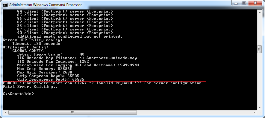 *With best Regards,* Kulamani Sethi, Bangalore, India Mob: 9964286962 ---------- Forwarded message ---------- From: <snort-users-owner () lists sourceforge net> Date: Mon, Nov 21, 2016 at 6:19 PM Subject: error in sort configuration To: kulamani.sethi () gmail com Please subscribe to the list in order to post. ---------- Forwarded message ---------- From: Kulamani Sethi <kulamani.sethi () gmail com> To: snort-users () lists sourceforge net, Srikanth Reddy < srikanthkumar.net () gmail com> Cc: Date: Mon, 21 Nov 2016 18:19:23 +0530 Subject: error in sort configuration Hi All, I am a new user in snort. I successfully installed snort_2_9_8_3 and trying to configure Snort.conf file. Getting some unexpected error when executing this command "C:\Snort\bin>snort -i 1 -c c:\Snort\etc\snort.conf -A console" i.c: invalid keyword '}' for server configuration. Please see below screen-shot. [image: Inline image 1] [image: Inline image 3] *With best Regards,* Kulamani