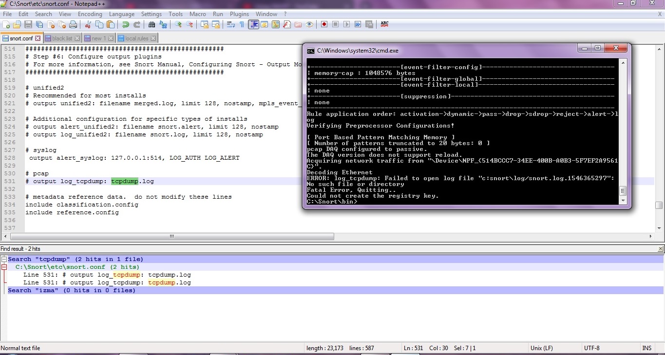 Make sure you create both files in your rules directory. white_list.rules black_list.rules Your line 511 should be: whitelist $WHITE_LIST_PATH/white_list.rules, \ WINSNORT.com Management Team Member -- ******************************************************** * Since 2002 ~~ Visit http://www.winsnort.com * ~~ FREE Windows installation Tutorials ~~ * ~~ FREE Support Forums ~~ * Snort: Open Source Network IDS - http://www.snort.org ******************************************************** *From:* Snort-users <snort-users-bounces () lists snort org> *On Behalf Of *Jawad Hussain Awan via Snort-users *Sent:* Monday, December 31, 2018 12:59 PM *To:* snort-users () lists snort org *Subject:* [Snort-users] Snort Installation Problem in Windows 7 Hi dear members; Hope you all are well and doing well. Please find following two snapshots showing error while running snort installation. -- *Best Regards;* *Jawad Hussain Awan* *Research Scholar*