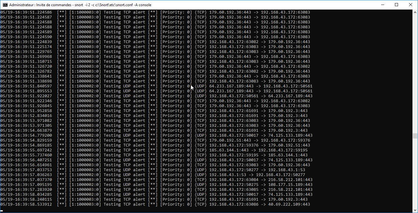 You have set up an interface network called 0 What is your interface network name ? Provenance : Courrier <https://go.microsoft.com/fwlink/?LinkId=550986> pour Windows 10 ------------------------------ *De :* Snort-users <snort-users-bounces () lists snort org> de la part de Joseph Nowa via Snort-users <snort-users () lists snort org> *Envoyé :* Saturday, May 18, 2019 2:52:12 PM *À :* snort-users () lists snort org *Objet :* [Snort-users] ERROR RUNNING IDS MODE ON WINDOWS Hi all, I just installed and configured Snort on windows. After updating my local.rules files i ran this command in the command prompt: "*snort -i 0 -c c:\Snort\etc\snort.conf -A console" *and i got this error in return: *The DAQ version does not support reload. Acquiring network traffic from "0". ERROR: Can't start DAQ (-1) - (J! * *Fatal Error, Quitting.. * I use an Windows 10 Entreprise x64 Will appreciate your help, please. -- Regards.. *Joseph Nowa Fotso* *Tel: +237670034207 / +237695951274 * *josephnowa1 () gmail com <josephnowa1 () gmail com>*