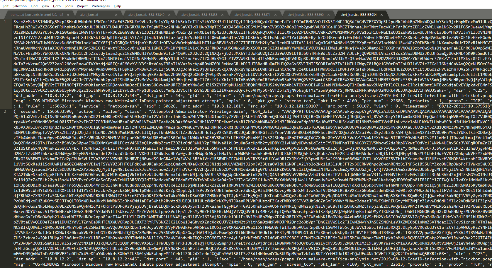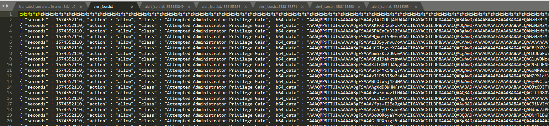 Hello, I just found truncated json alerts while reviewing the logs. I ran a large number of pcap files through snort3 with the Registered ruleset, (and built in rules turned off). This generated over 17,000 alerts (which is what i expected, since i'm using 5 GB of pcaps that hold various malware as well as the test pcap files from security onion's ISO). However, I found that some of the alerts were written only partially with the json output. I have the json file size set to 10 MB, and these 17k alerts were written across 6 files: alert_json.txt.1588153836 alert_json.txt.1588153849 alert_json.txt.1588153871 alert_json.txt.1588153890 (first event is corrupt) alert_json.txt.1588256824 alert_json.txt (first event is corrupt) the corrupted (they look to be missing some of the first part of the event) alerts show up in alert_json.txt at the head of the file, seem to start mid-event right in the middle of b64 data field. this also happens with alert_json.txt.1588153934 so as you can see, it seems that the 5th and 7th log files are each missing the start of at least one event. I'm attaching screenshots showing alert_json.txt (without word-wrap so you can see each event on it's own line) and alert_json.txt.1588153934 with word-wrap so you can see the whole event. [image: alert_json.txt.png] [image: alert_json.txt.1588153934.PNG]