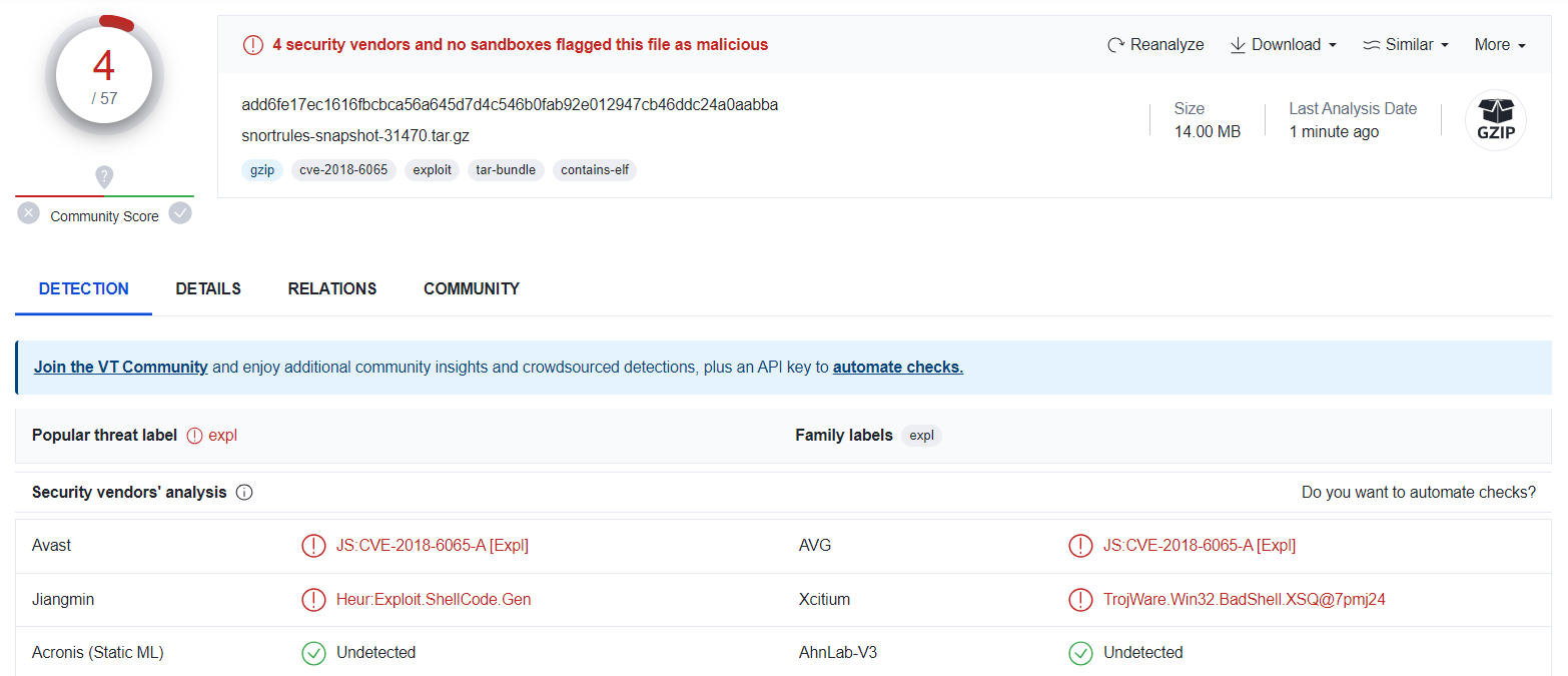 No, Virus total does not flag anything when pasting the Rules URL. When uploading the file though, 4 vendors flag the file as malicious as shown in the attached screenshot. Von: Dzmitry Khmialkou <dmitri.hmelkov () gmail com> Gesendet: Montag, 12. Juni 2023 18:18 An: Rostanin Gleb SBR DIRCS <Gleb.Rostanin () zf com> Cc: snort-sigs () lists snort org Betreff: Re: [Snort-sigs] Snort 3 rules - Antivirus Is Virustotal reports the same? пн, 12 июн. 2023 г. в 16:35, Rostanin Gleb SBR DIRCS via Snort-sigs <snort-sigs () lists snort org<mailto:snort-sigs () lists snort org>>: Dear Snort community, I recently registered to be able to download the Snort 3 rules. Unfortunately, when downloading, Windows defender started complaining that a Virus was detected. Is this normal behavior or am I currently being attacked 😃? Kind regards Gerry _______________________________________________ Snort-sigs mailing list Snort-sigs () lists snort org<mailto:Snort-sigs () lists snort org> https://lists.snort.org/mailman/listinfo/snort-sigs<https://lists.snort.org/mailman/listinfo/snort-sigs> Please visit http://blog.snort.org<http://blog.snort.org> for the latest news about Snort! Please follow these rules: https://snort.org/faq/what-is-the-mailing-list-etiquette<https://snort.org/faq/what-is-the-mailing-list-etiquette> Visit the Snort.org to subscribe to the official Snort ruleset, make sure to stay up to date to catch the most <a href=" https://snort.org/downloads/#rule-downloads<https://snort.org/downloads/#rule-downloads>">emerging threats</a>!