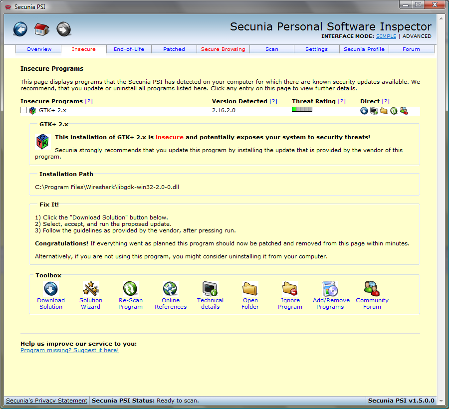 A security issue is being reported by the 'Secunia PSI' vulnerability