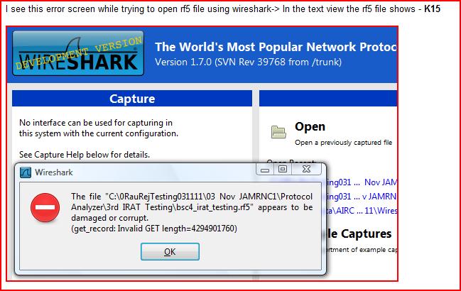 - Tektronix K15 .rf5 file not opening in Wireshark 1.62...Invalid GET length Ramrenu Chakrabarti R (Nov 15)