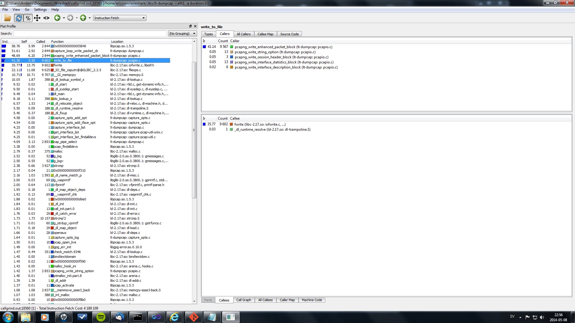 I'm not sure but from the picture there seems to be a bit of overhead per write so if we reduce the fwrites() to 3, hdr-pkdata-footer with hdr and footer being a local buffer[x] it might make some difference.On May 8, 2014, at 1:02 PM, Anders Broman <a.broman () bredband net> wrote:It might be worth it to reduce the number of write_to_file() by putting stuff in a buffer before writing to file.write_to_file() calls fwrite(), which puts stuff in a buffer before writing to the file in the sense of "calling write() or WriteFile()). Would adding another layer of buffering atop the standard I/O library buffering make a significant difference here? (libpcap, as used by, for example, tcpdump, makes multiple fwrite() calls per packet written.)